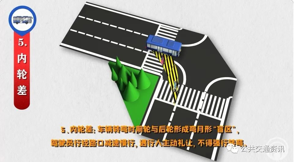 5、內(nèi)輪差:車輛轉(zhuǎn)彎時(shí)前輪與后輪形成彎月形“盲區(qū)”,駕駛員行經(jīng)路口減速慢行,遇行人主動(dòng)禮讓,不得強(qiáng)行轉(zhuǎn)彎。