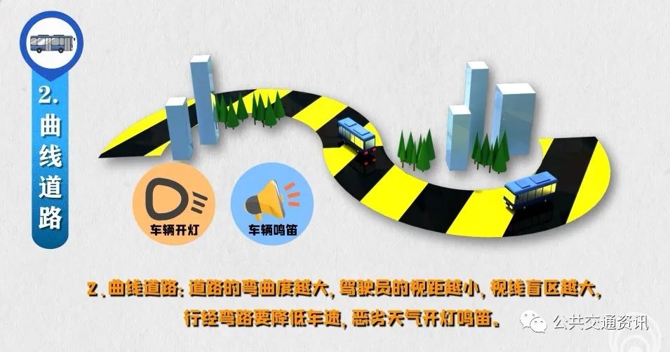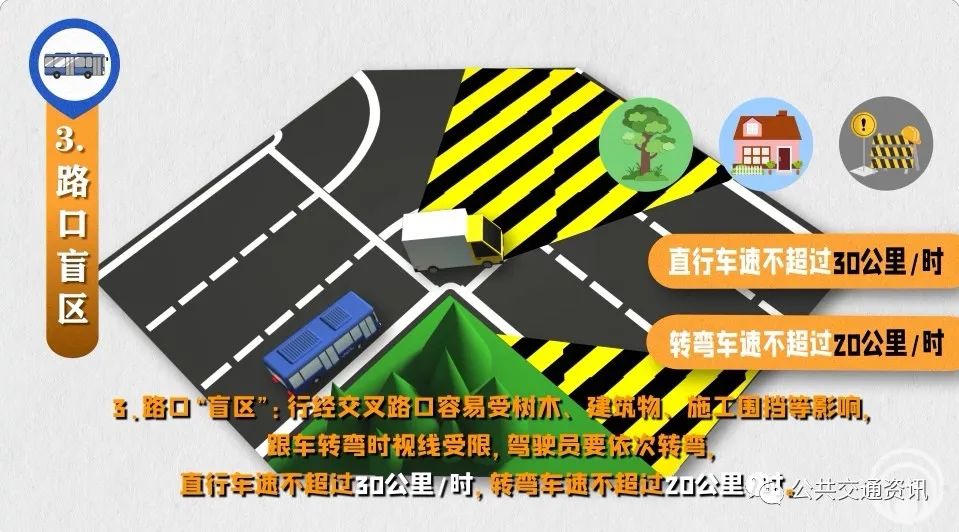 3、路口“盲區(qū)”:行經(jīng)交叉路口容易受樹(shù)木、建筑物、施工圍擋等影響,跟車轉(zhuǎn)彎時(shí)視線受限,駕駛員要依次轉(zhuǎn)彎,直行車速不超過(guò)30公里/時(shí),轉(zhuǎn)彎車速不超過(guò)20公里/時(shí)。