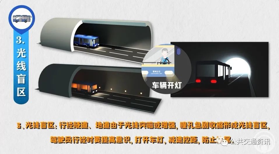 3、光線盲區(qū):行經(jīng)隧道、地道由于光線突暗或增強(qiáng),瞳孔急劇收縮形成光線盲區(qū),駕駛員行經(jīng)時(shí)要提高意識(shí),打開(kāi)車燈,減速控距,防止追尾。