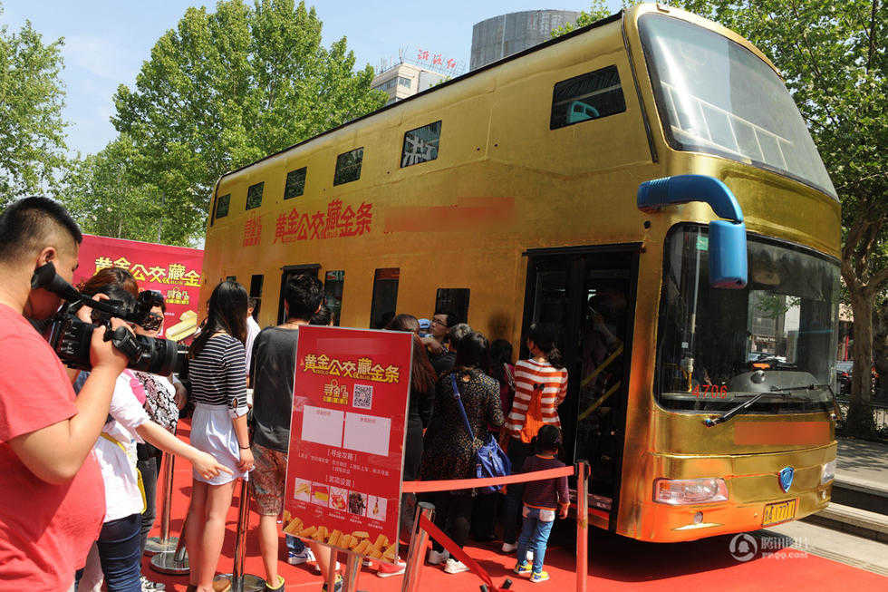 4月25日,一輛“黃金公交車”亮相山東濟(jì)南。據(jù)介紹,該公交車80%的部分都貼了金箔,“黃金美女”模特身上佩戴的黃金飾品價值兩百萬,公交車車內(nèi)掛滿了數(shù)千件黃金飾品,重達(dá)幾十公斤,總共價值500余萬。(來源:騰訊新聞 陳寧/CFP)