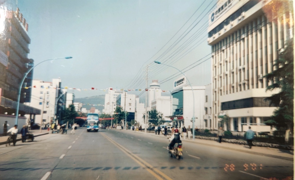 ▲90年代初,荊門市象山大道街景(?;坜D盤)。道路上車輛很少,公交車、摩托車、自行車是主流。