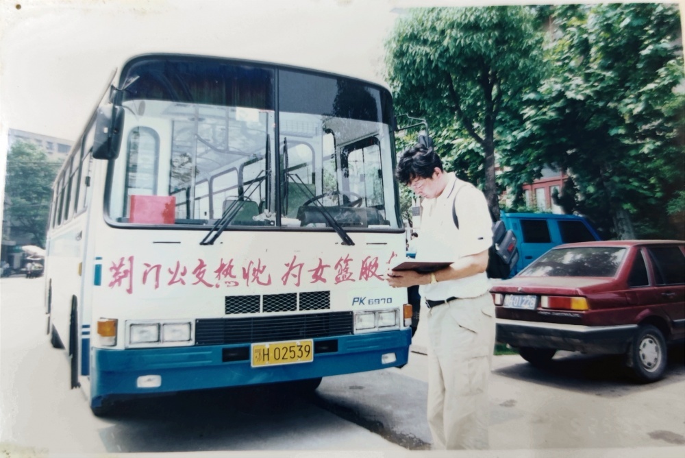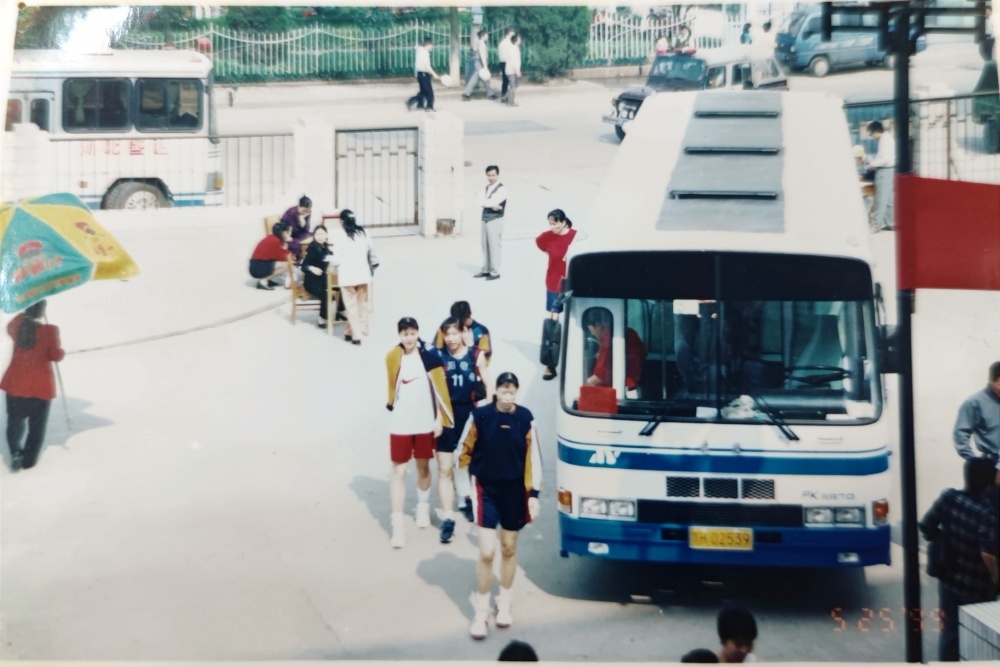▲1999年5月25日,到達(dá)荊門(mén)石化體育館。遠(yuǎn)處看女藍(lán)隊(duì)員走過(guò)公交車(chē),個(gè)頭真的高。