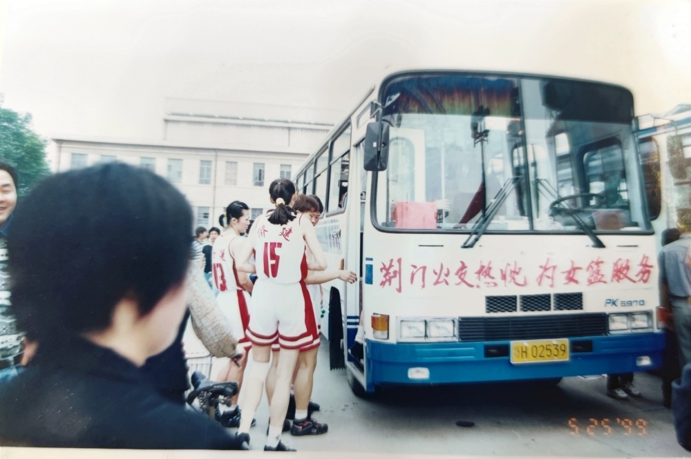 ▲1999年5月25日,沈陽(yáng)電梯隊(duì)隊(duì)員、教練乘坐公交出行。公交車(chē)頭還掛有“荊門(mén)公交熱忱為女籃服務(wù)”橫幅。