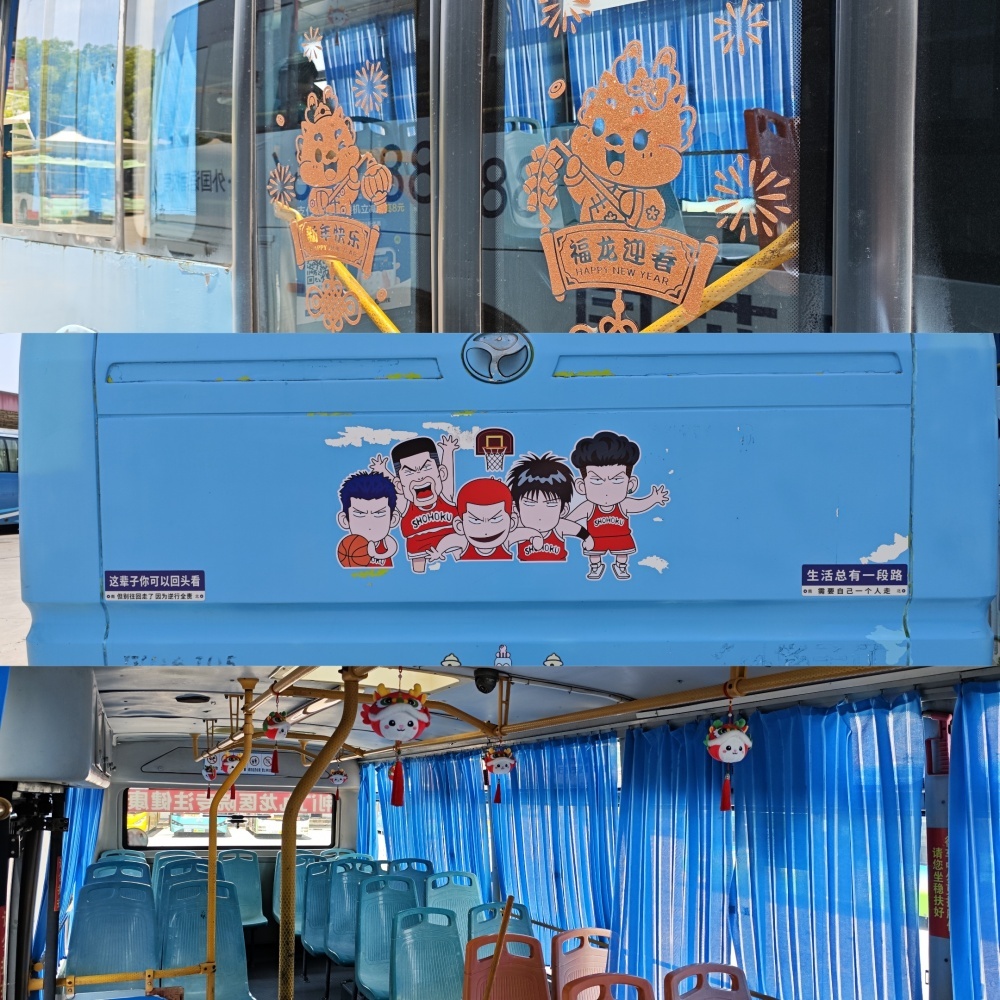 2020#車還有另外幾處細節(jié),引起小編注意,上下車門處貼有卡通人物和“福龍迎春”貼紙,車尾部貼有“灌籃高手”人物貼紙和提示標語,車廂內的扶手桿則掛滿了喜慶娃娃。看到這些裝飾和布置,仿佛感受到了駕駛員的熱情、認真和細膩。