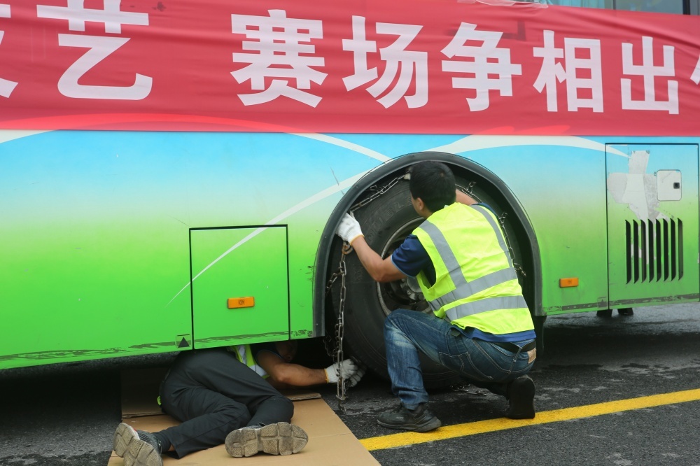 在安裝防滑鏈項目比武現(xiàn)場,市公交集團汽修公司員工王剛、劉小備兩人準備充分、配合默契——先由一人進入車底檢查車況,一人拿出防滑鏈等待安裝。很快,車況檢查結束,兩人迅速將防滑鏈套上輪胎,并將防滑鏈上的橡皮繩捆扎成規(guī)則五角形,經(jīng)檢查內外側松度并無明顯松垮現(xiàn)象后,以3分09秒的成績結束比賽。