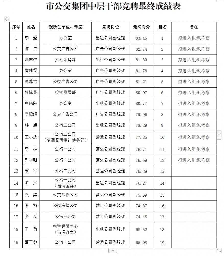 市公交集團(tuán)中層干部競聘最終成績公示