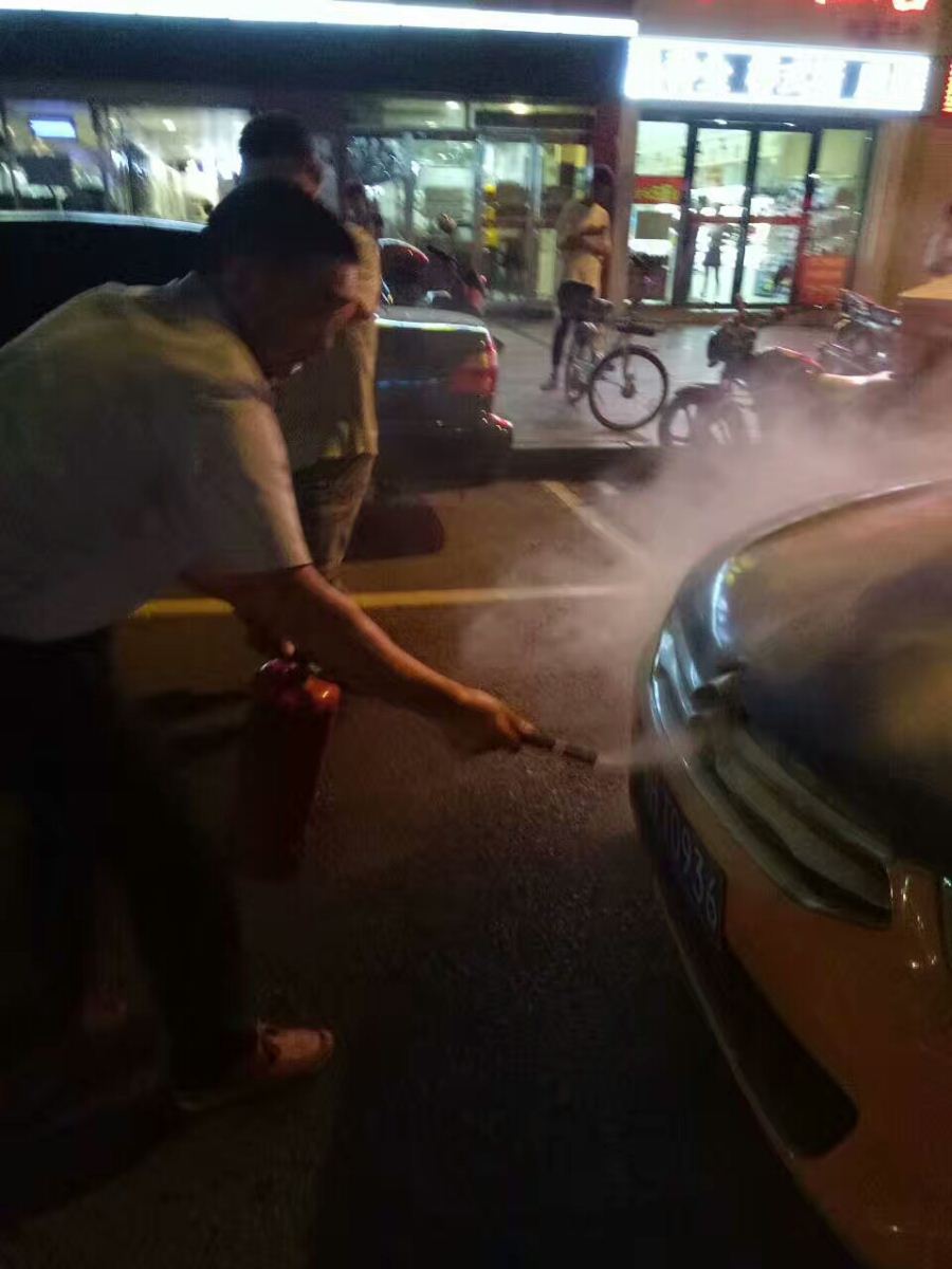 7月21日晚9時10分左右,公交集團(tuán)三公司2路車駕駛員陳旭駕駛鄂H0A073號行駛至金地廣場站,突然聽到馬路對面有人大聲疾呼“著火啦!救火!”,陳師傅忙停穩(wěn)車,只見對面一的士引擎蓋冒煙起火,他立即拿起公交車上的滅火器快跑到馬路對面,將出租車的火撲滅。