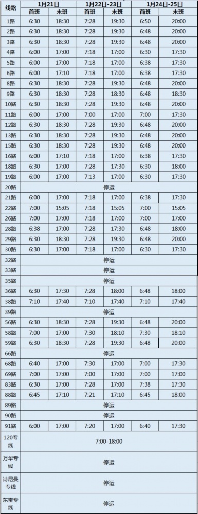 春節(jié)期間,市公交集團(tuán)公交線路營運(yùn)計劃有調(diào)整。2023年1月21日-1月25日(除夕至初四)各營運(yùn)線路相較平常在首末班次、發(fā)班間隔上有所變化,為方便廣大市民春節(jié)前后出行,現(xiàn)將春節(jié)期間公交營運(yùn)安排通告如下: